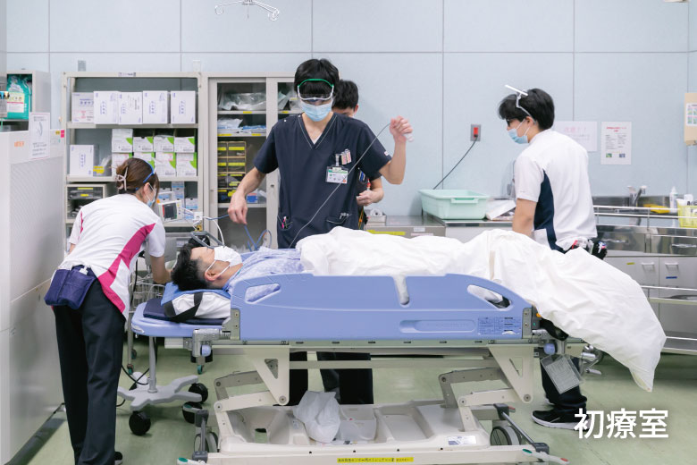 重篤な救急患者さんの生命予後は、病気やけがの治療をいかに早く開始できるかにかかっています。このため、患者さんが救急車で搬送されてくる場合、直接医師が救急隊から情報を専用携帯電話(ホットライン)で聞いて、すぐに初療室で患者さん受入の準備を始めます。病院や診療所から救急患者さんが転院搬送される場合も同様です。迅速に治療を開始できるように、検査やレントゲンなどすべての部門において救急患者さんを優先しています。救急患者さんが複数の場合は、緊急度と重症度の高い患者さんが優先されます。これらのことに対するご理解とご協力を地域の皆様にはお願いします。