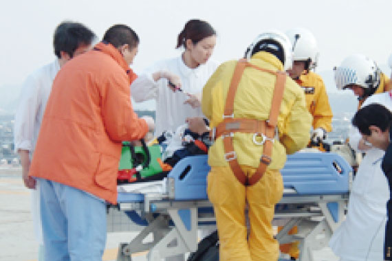 病院の屋上にはヘリポートがあり、過去には、郡上の山奥で転落された重症救急患者さんが、現場から10分でヘリコプター搬送され、着陸後5分で救急診療を開始しました。骨盤骨折と膝蓋骨骨折でした。また白鳥の病院で急性心筋梗塞と診断された重症救急患者さんが、その病院の近くから13分で当センターのヘリポートへ搬送されました。着陸後6分で救急診療を開始しました。お二人とも順調に回復されました。