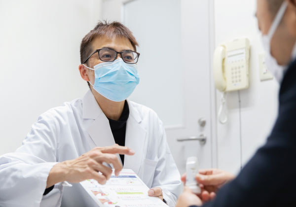 抗がん剤を投与する患者さんに対して、医薬品の説明、投与スケジュール、想定される副作用の初期症状と発現時期等について薬剤師による指導を実施しています。外来化学療法実施当日には、診察前に患者さんの服薬状況、副作用の有無や程度などを確認する面談を行います。薬剤師は、面談で知り得た情報を医師にフィードバックするとともに、支持療法薬の処方提案などを行っています。
