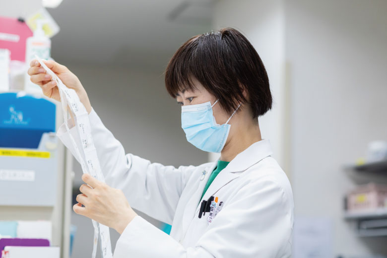 主に入院処方の調剤を行っています。患者様の服用しやすいように粉砕や一包化を行ったりします。医師の処方した薬の量や飲み方が適正か、検査結果とも照合し問題ないか確認し、調剤を行っています。