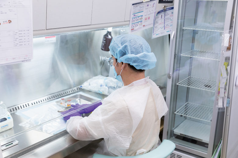 抗がん剤調製は、安全キャビネットを用いて、正確かつ安全に抗がん剤を調製しています。調製だけではなく患者様が安心して治療を受けられるように抗がん剤の治療計画(レジメン)の管理や副作用を軽減する処方提案、検査値などの確認を行っています。