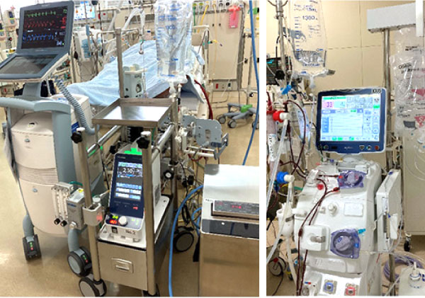 血液透析、持続緩徐式血液濾過透析、血漿交換、直接血液灌流などの急性血液浄化や補助循環、人工呼吸器の操作やラウンドなどを行っています。