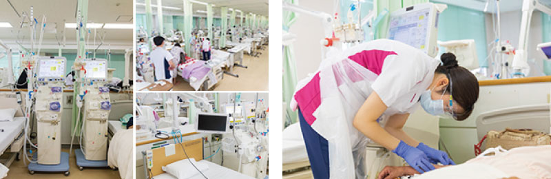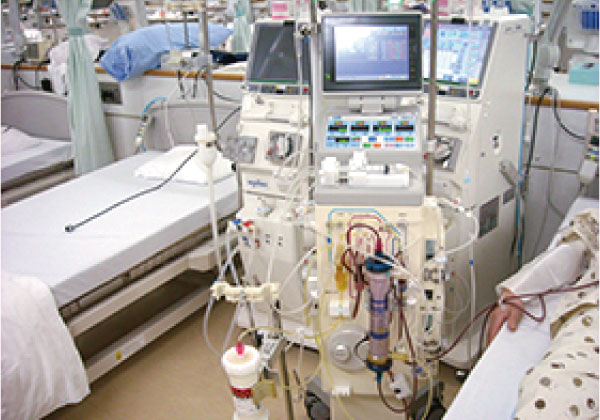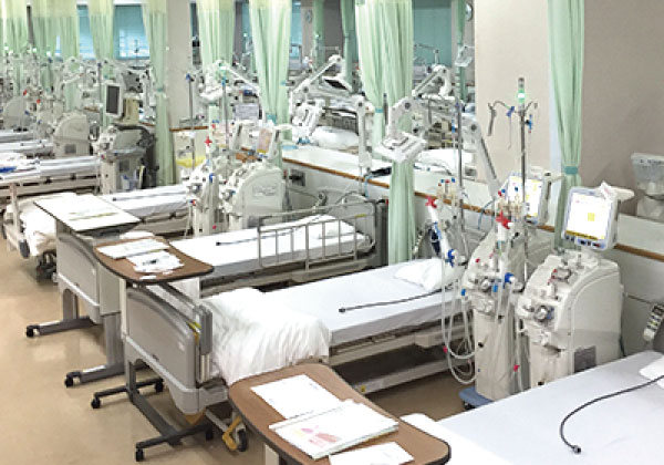 最新の透析装置や透析中央監視システム(Future Net Web)を導入し、透析の始まりから終了まで、機械が自動的に透析を行なう全自動透析システムを採用しています。また、適切な水質管理をおこない、患者さんの身体に負担が少ない「オンラインHDF」が可能となっています。透析医療の安全に努めており、安心して血液透析療法が受けていただける設備を整えています。