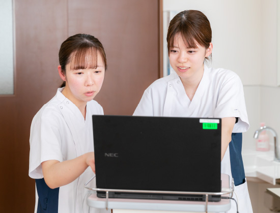当院の看護部では、PNS(パートナーシップ・ナーシング・システム)を導入し、先輩看護師2名に加わる形から始めます。毎日の看護ケアはもちろん、委員会活動、病棟内の係の仕事に至るまで、一年を通してその成果と責任を共有します。経験や年齢に関わらず対等な立場で、互いに声をかけ合い、確認し合いながら業務を進めることで、患者さんにとって安心・安全な看護を提供しています。