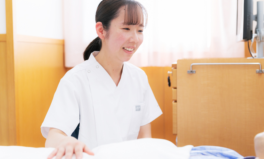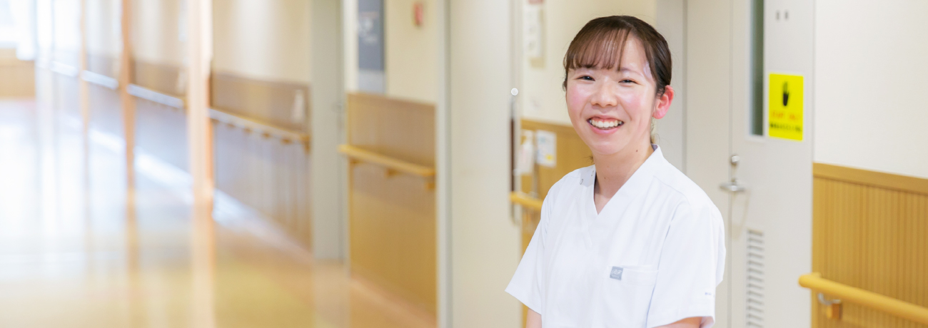 4階西病棟の消化器・血液内科の混合病棟で勤務しています。患者さんの身体状態の観察や、療養上のケアの介助を主に行っています。