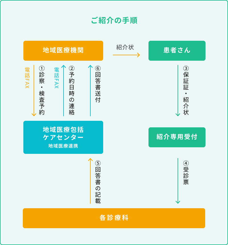 - 地域医療連携室に電話をいれて頂き、診察・検査予約を申込んでください。